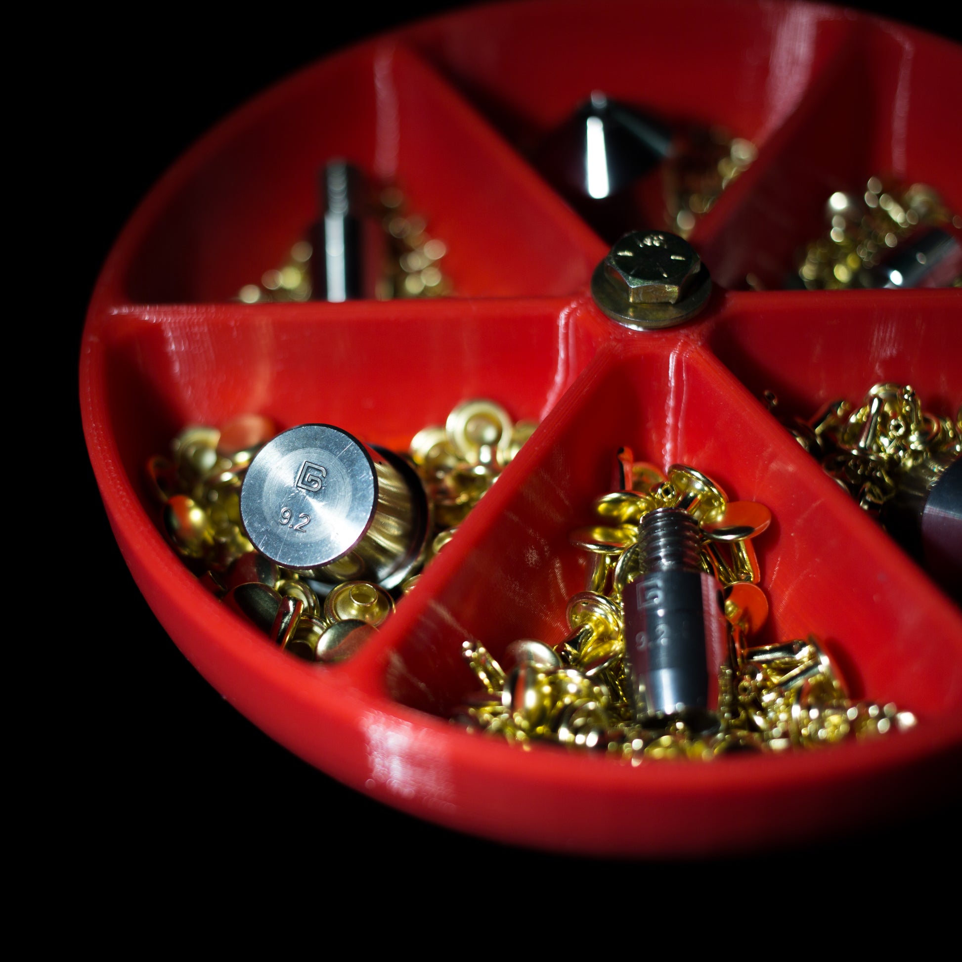 The Rotary Tray attaches to the Bedrock Foot Press Stand to keep your fasteners close at hand. Tray can be mounted to the Left, Front, and Right side of the Bedrock Stand. Two Rotary Trays can even be used in the same location for even more storage.