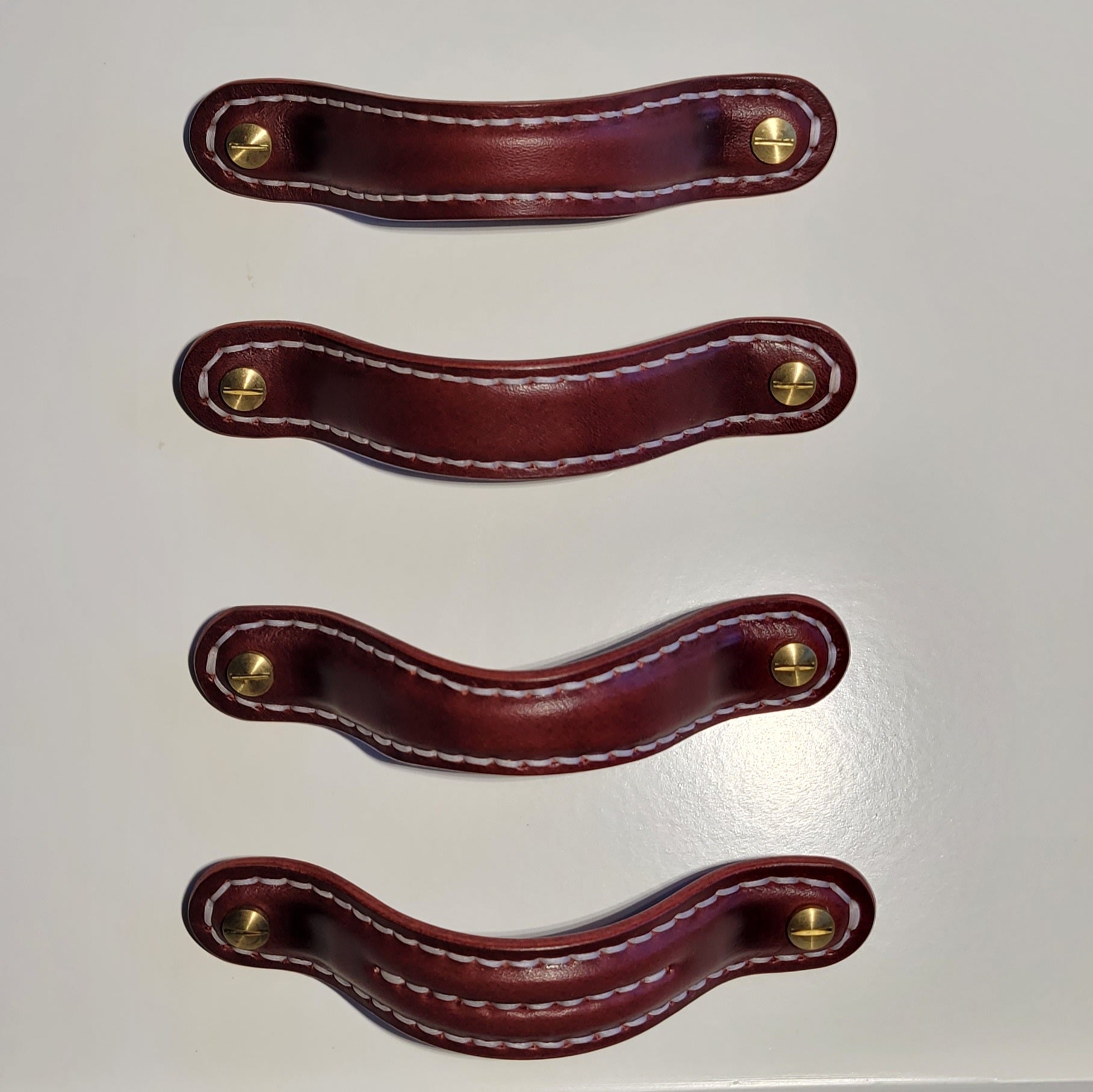 The Cane Mountain Leather Co drawer handles come in four different styles and three different color options. Our drawer handles are handcrafted with a Stainless Steel core, wrapped in Full Grain vegetable tanned leather that will age beautifully. Each handle is saddle stitched by hand using white waxed polyester thread (other thread colors available upon request, just send us an email at support@canemtn.com before ordering). Hardware is brass with 3/4 inch long 8-32 screws.