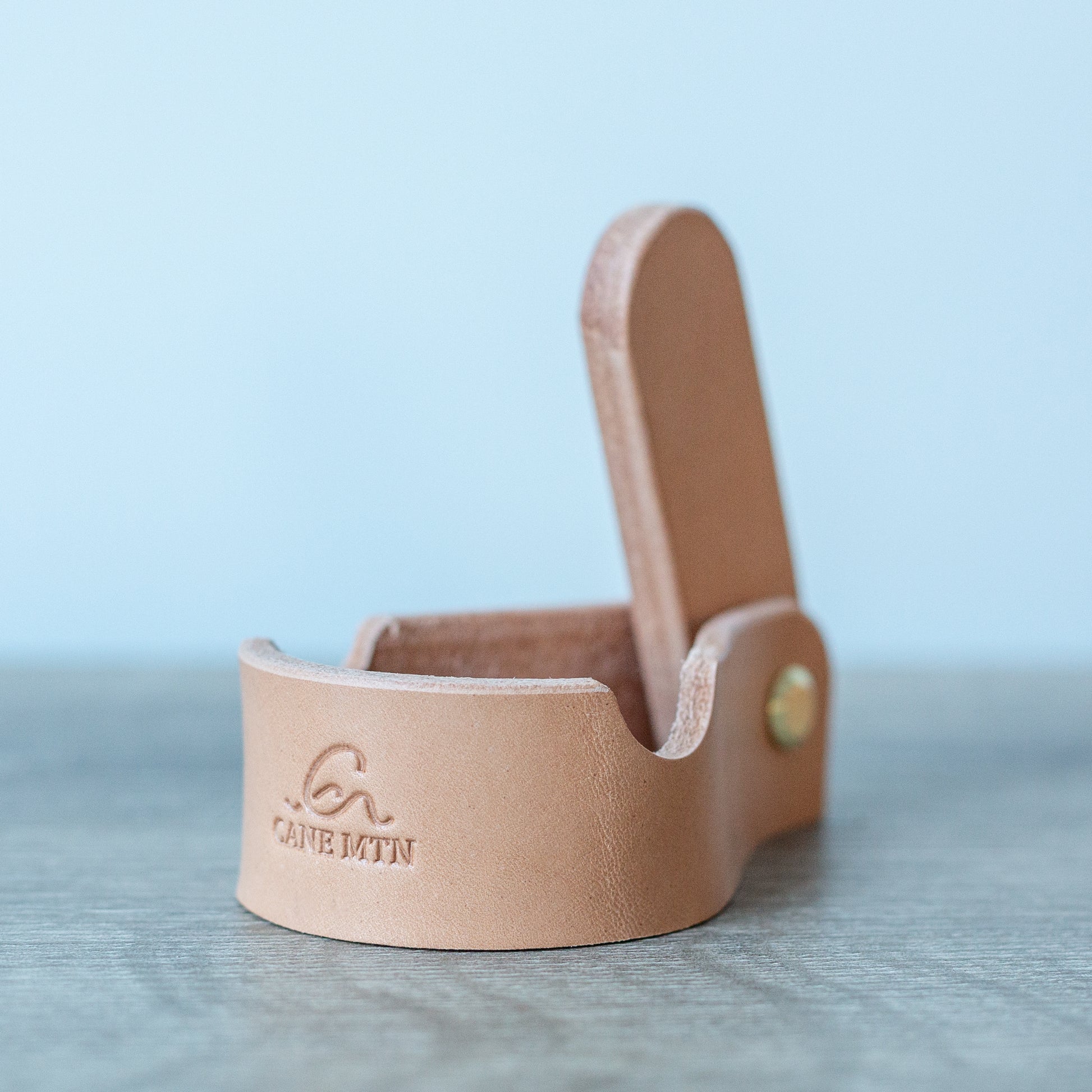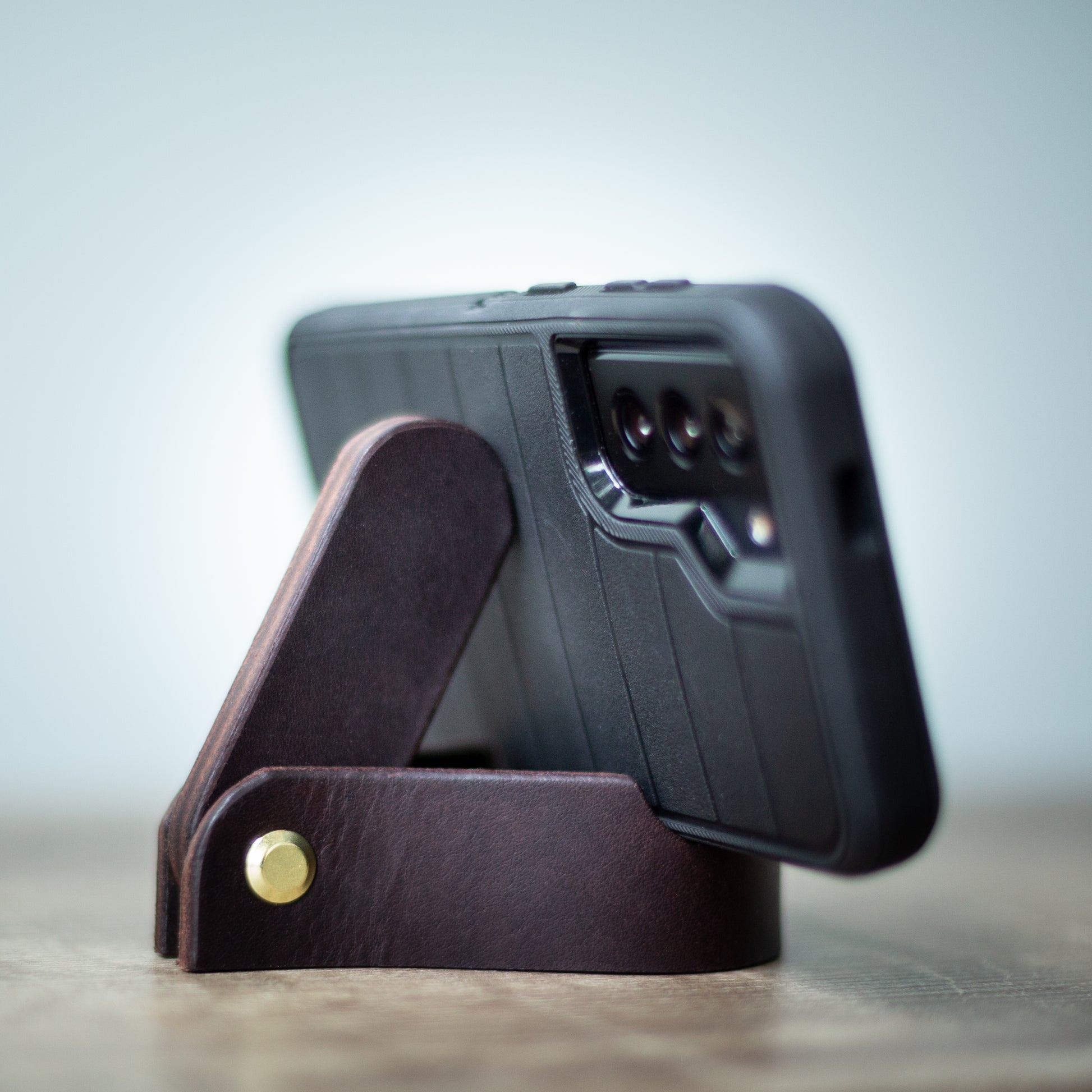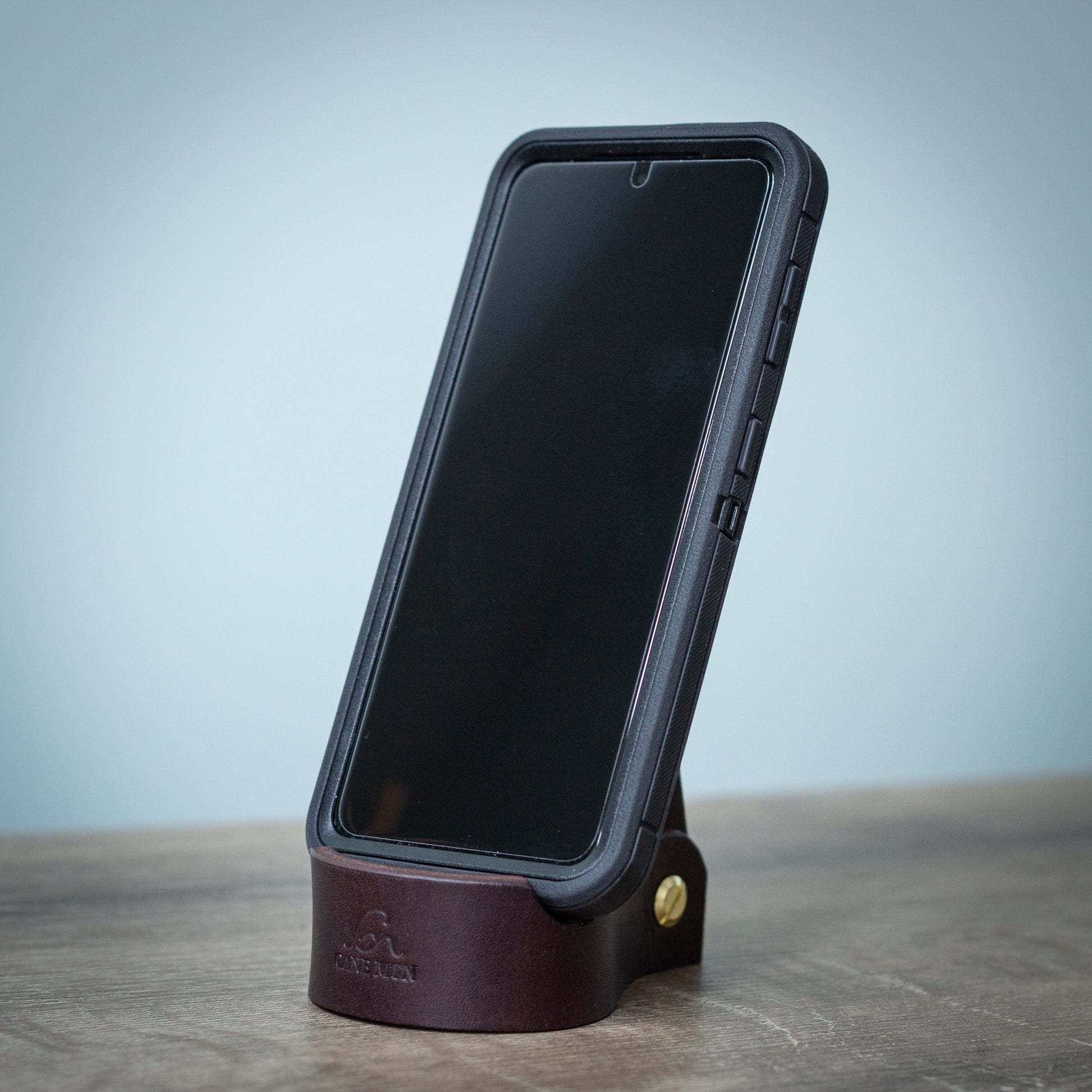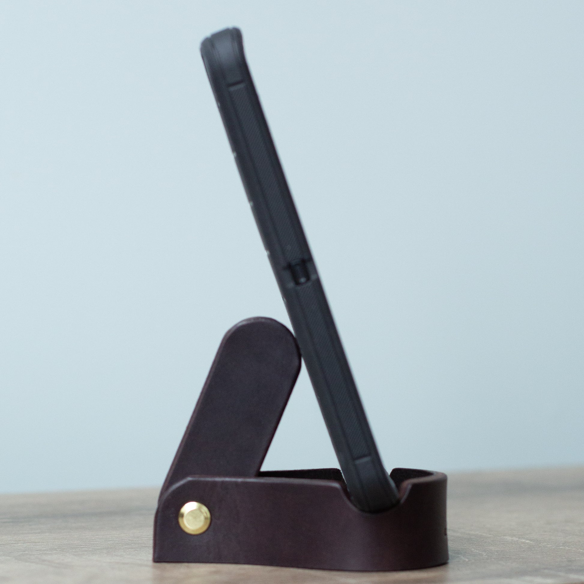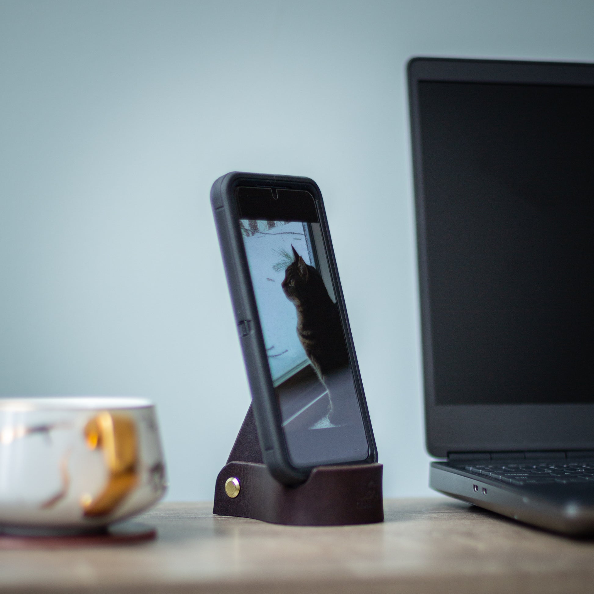 Our handcrafted full grain leather Device Stand will look great on your desk. The stand can be adjusted to your preferred viewing angle. Great for video calls or viewing your favorite recipe while cooking!