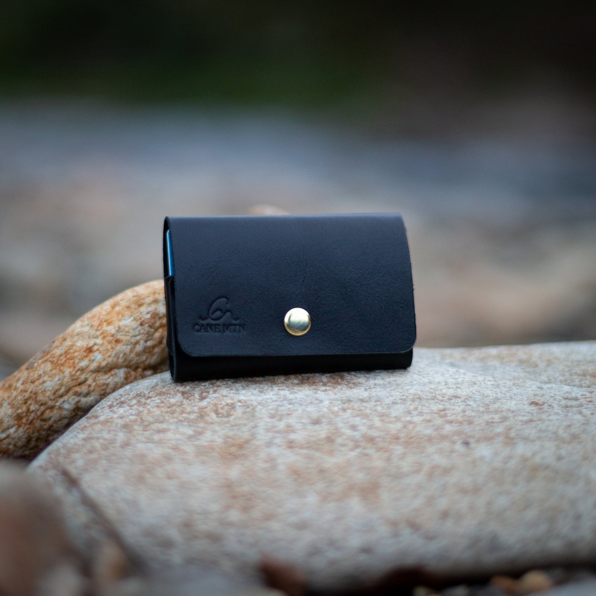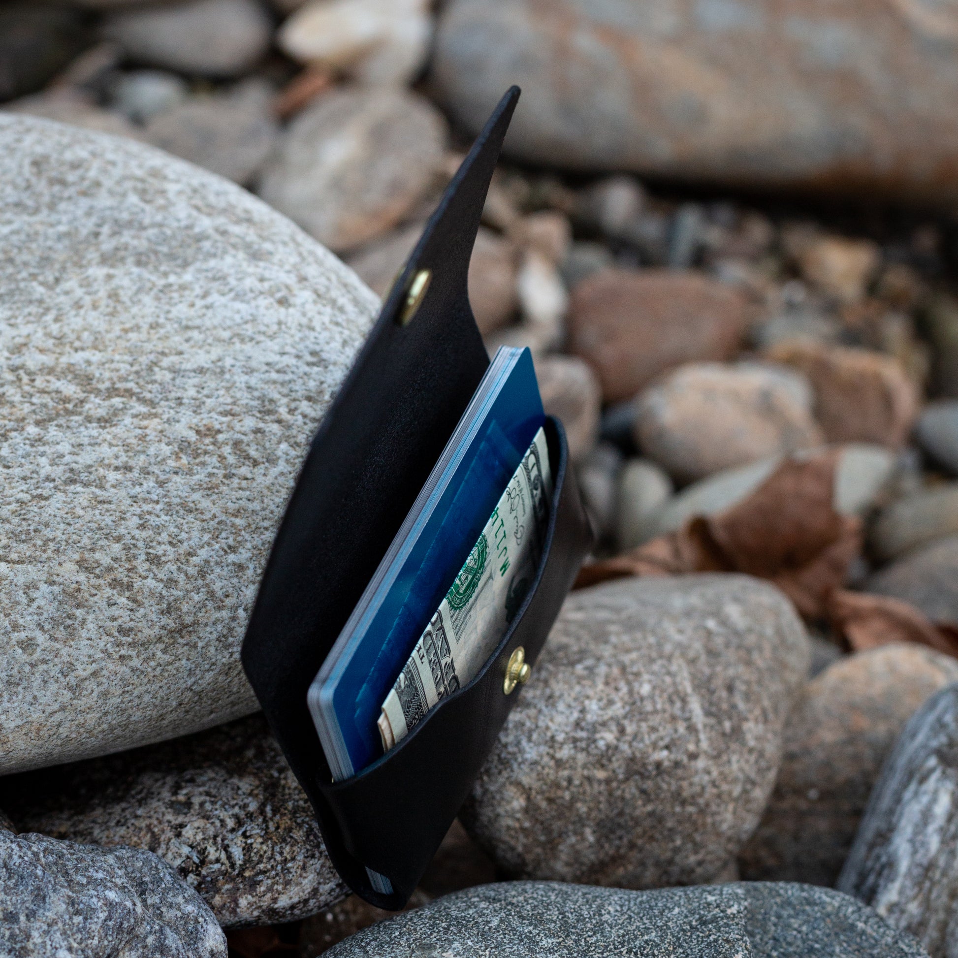 Full grain leather card wallet, with brass rivets and snap. Designed to reduce bulk in your pocket, while providing full perimeter protection for your cards. Great for front pocket carry.